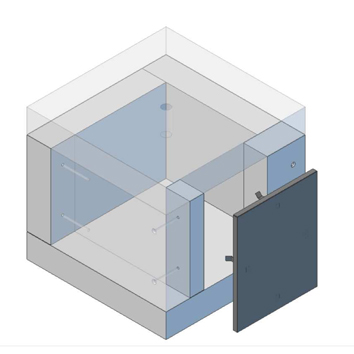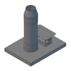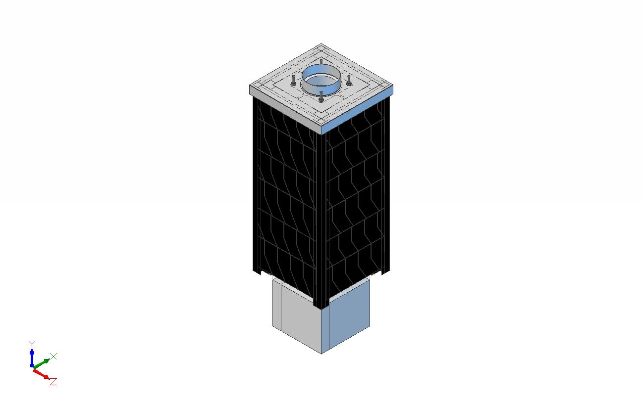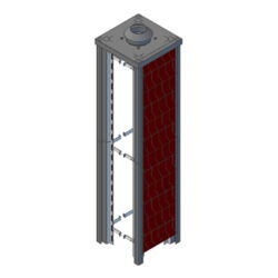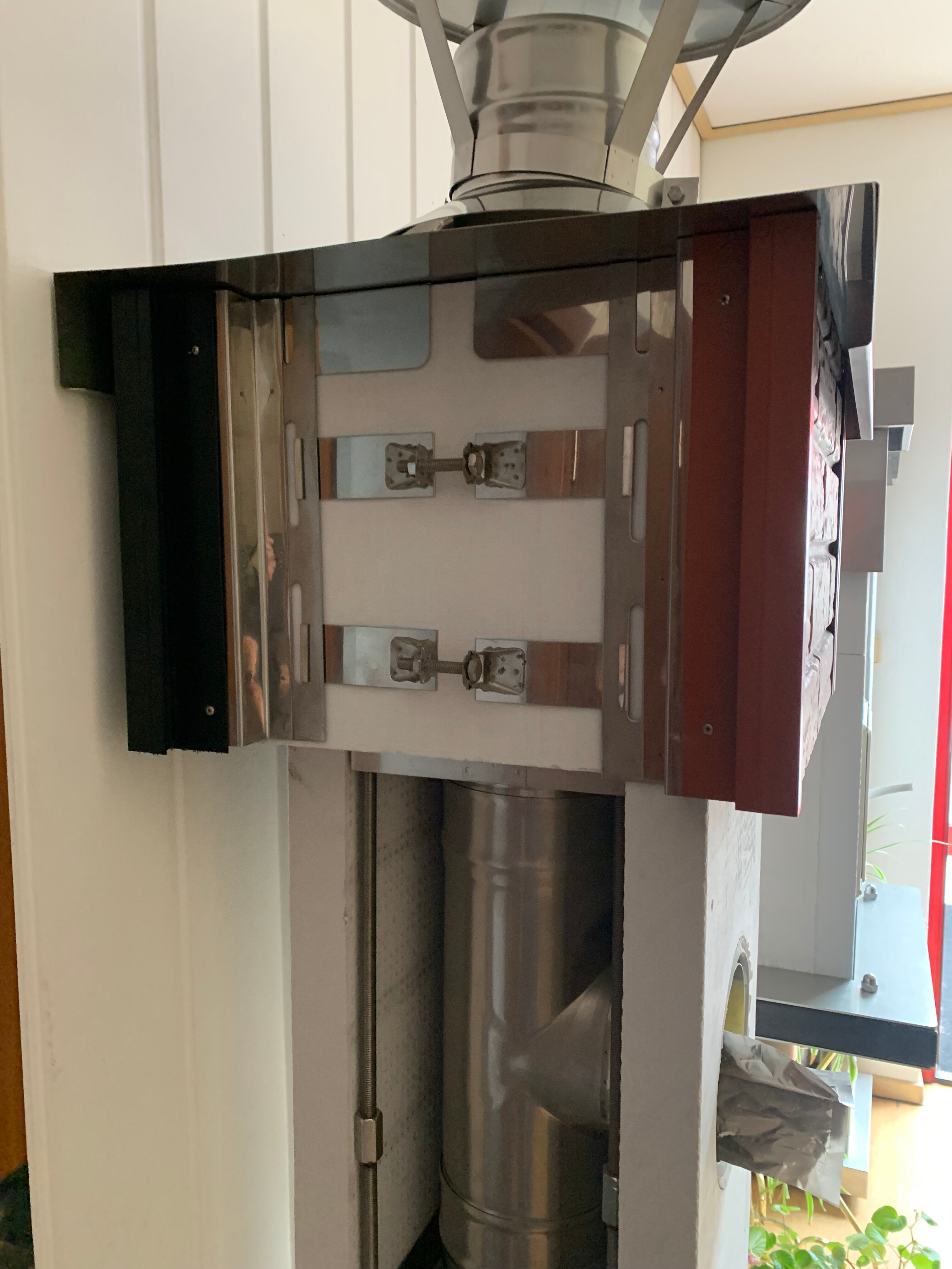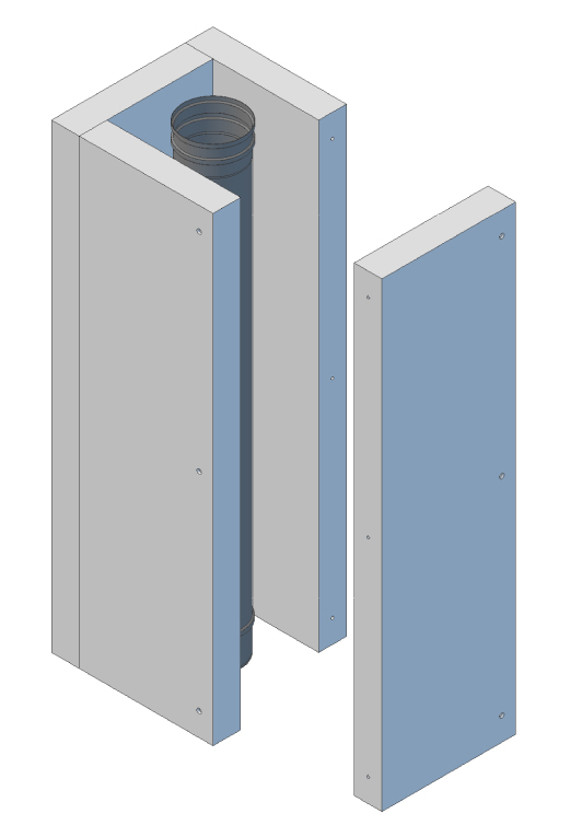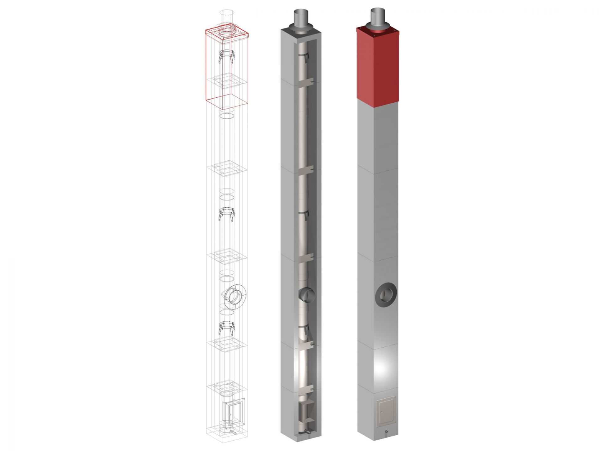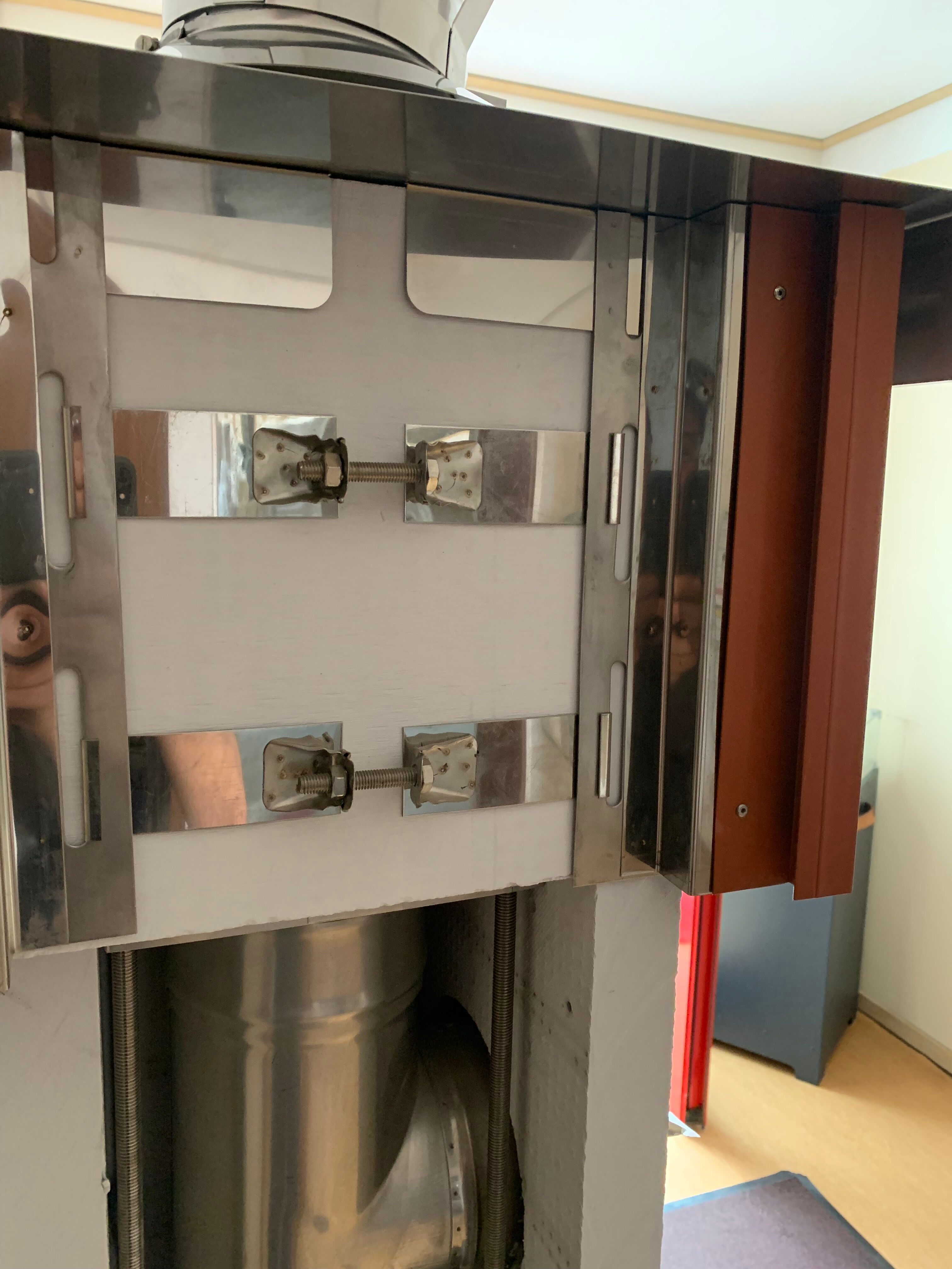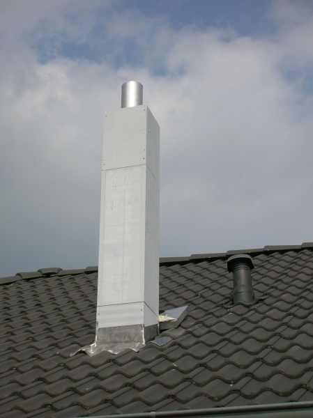 Die rauchgasführende Innenschale besteht aus Rohren und Formteilen in Edelstahl der Güte 1.4571/1.4404, in der Materialstärke von 0,6 mm. Die Aussenschale besteht aus Calcium-Silikat-Platten mit 40 mm Stärke.